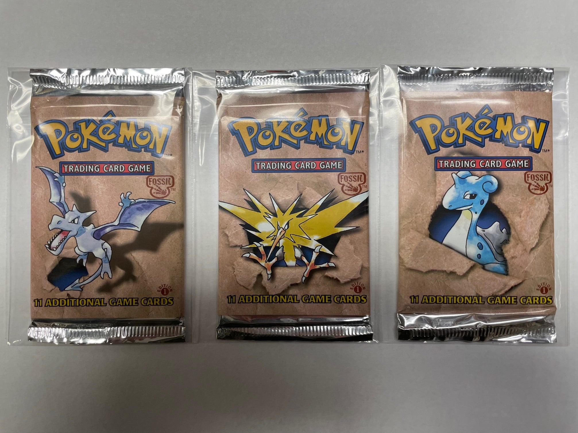 POKEMON FOSSIL FIRST EDITION BOOSTER PACK ART SET (AERODACTY, LAPRAS, ZAPDOS)